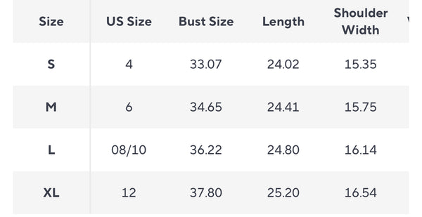 XL : Bust 96cm, Sleeve 64cm, Shoulder 39cm, Length 63cm