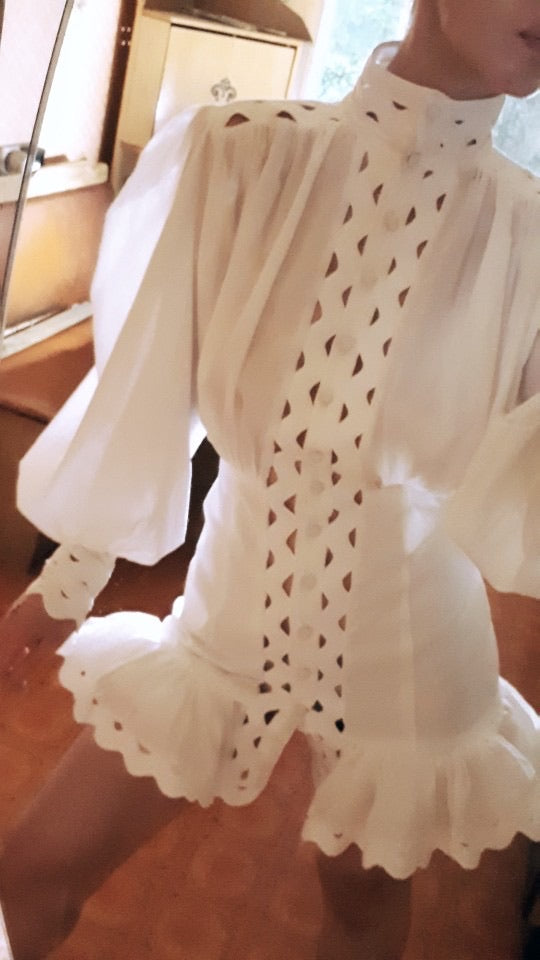 Long Lantern Sleeve Cut Out Ruffle Hem Shirt Dress