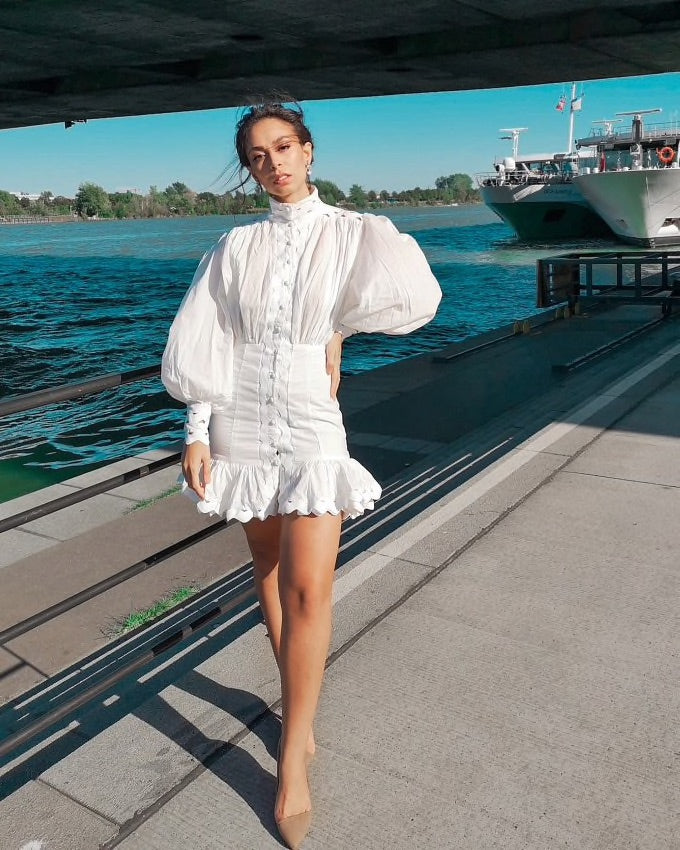 Turn heads is this stunningly luxe Long Lantern Sleeve Cut Out Ruffle Hem Shirt Dress. With its figure fitting high waist form this dress is super flattering and is the ultimate in elegant chic. We like to finish the look with a pair of big statement earrings from Our Earrings Collection.